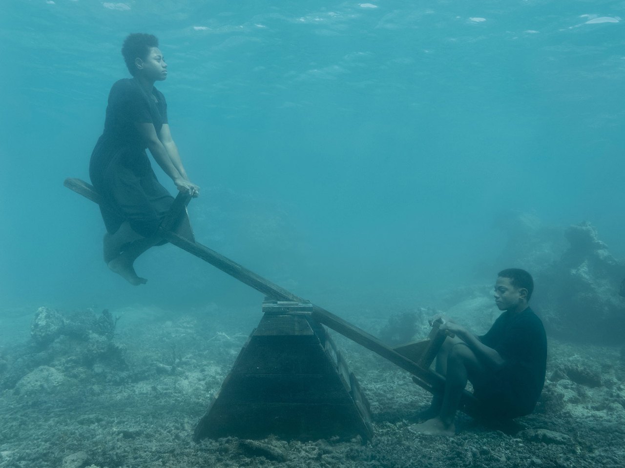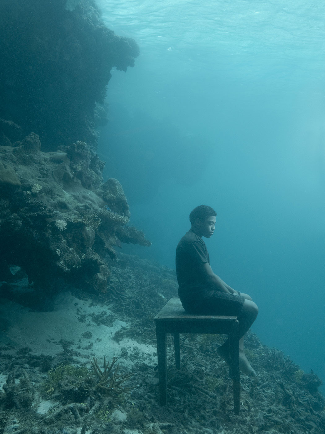 The focus is on the residents of the South Pacific islands directly affected by sea-level rise due to climate change. In the artworks captured underwater in the sea off the coast of Fiji, people represent the countless individuals who may lose their homes, land, and livelihoods for decades to come due to rising sea levels. All the figures and objects depicted in the artworks were captured underwater.